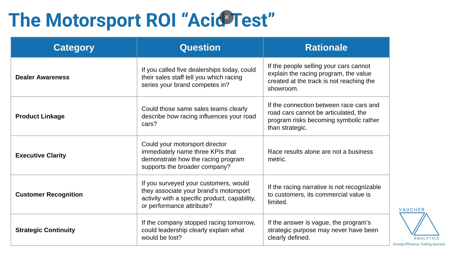 Question: If you asked your team principal or motorsport director right now, could they immediately name three business KPIs that demonstrate how the racing program supports the broader company?